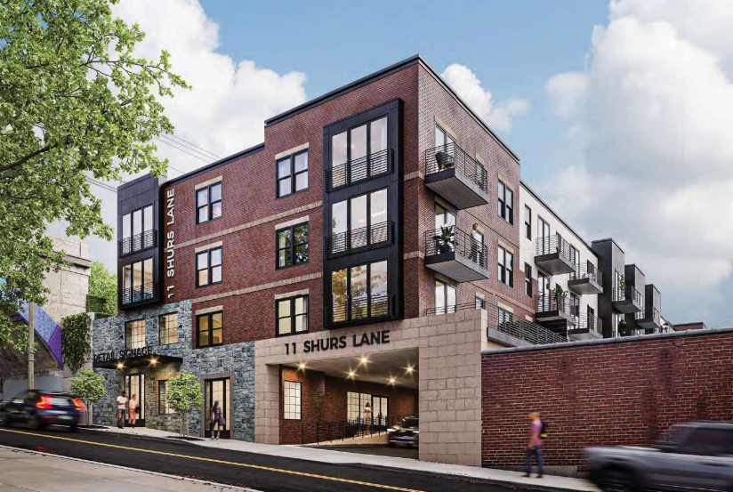 Thanks to plans from 3GHC Architects we can see that the front facade will include brick and stone, while the sides of the building will largely consist of cement board panel siding, with balconies and bay windows to break up the massing. The southern side of the building will be on the forgettable side of the spectrum, but there are plans for a new seven story building just to the south at 4045-61 Main St., which will largely obscure that side of the building. If anything, this tells us that the project at 11 Shurs Ln. should be a little taller, but we suspect that would have complicated the negotiations on the aforementioned variance.