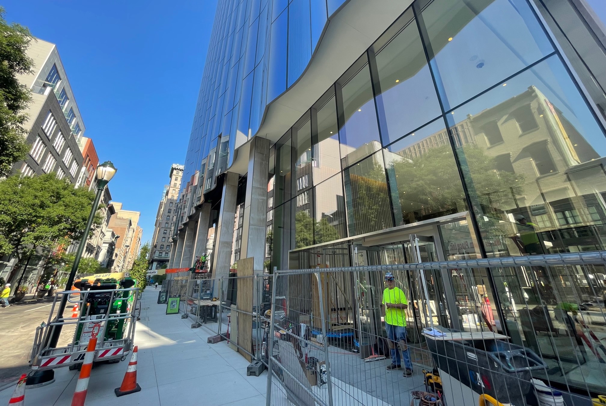 The construction at 1101 Chestnut St., taking up the whole northern side of the block between 11th & 12th Streets, has made the area a bit of a challenge to navigate for years, as the Jefferson University-affiliated Honickman Center took the place of a less than beautiful parking garage. We had flashbacks of the closed-off sidewalks around the W/Element hotel just a few blocks away every time we made our way around the edges of the site. But much to our joy (and to the safety of pedestrians in the vicinity), the sidewalks are reopened around this Ennead-designed building.