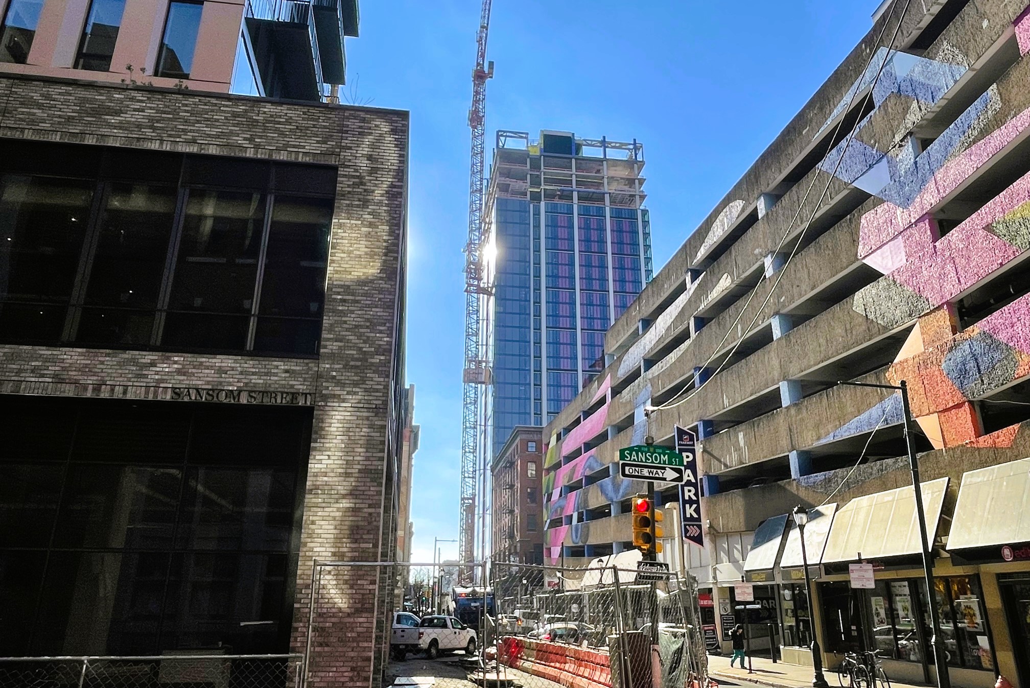 That’s right, we are referring to the 412-unit Jessup House that is going up at 123 S. 12th St., just a short walk from that 376-unit tower in the works. Originally slated to be focused on senior living, plans for this Greystar-developed project shifted to market rate apartments, with a design change to boot. Vertical orange panels break up the tower portion, which rises from a darker brick base, stepping back to almost make it feel like an overbuild of an existing building. The design from STUDIOS Architecture and BLT Architects is really rounding into form now, as work on the lobby entrance along Sansom St. was in full swing when we made our way past.