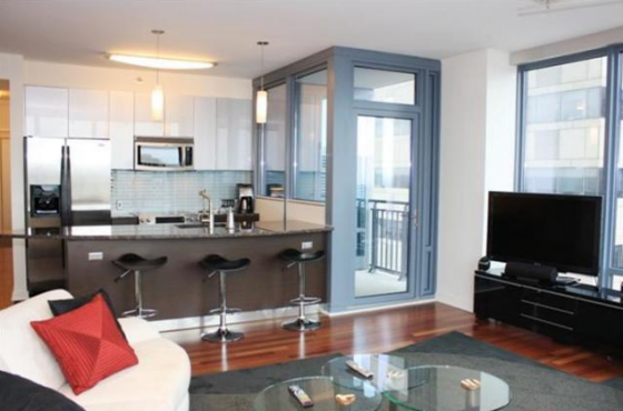 Black lacquered furniture, glass tables and red accents would be right at home in Gordon Gekko's Bridgehampton beach house, next to a fabulously late-1980s Daryl Hannah. ('You spent $400K on that Georgia O'Keeffe? You could get a beach house for that.' 'Yea, maybe in Wildwood, N.J.') This expanded 1,634-square-foot two-bedroom (plus den)