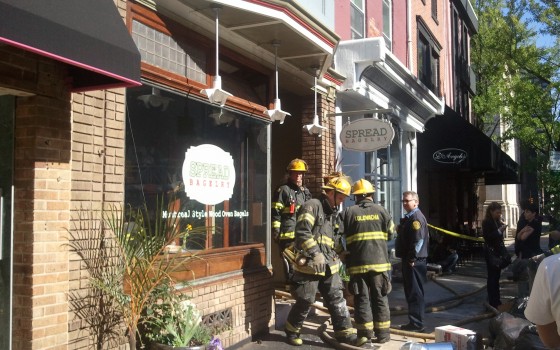 Spread Bagelry opened this Monday and four days later we have five firetrucks, a stretcher, massive hoses and a ton of angry drivers. The fire that just happened at Spread a few minutes ago left some apron-clad (owners? staff?) workers outside looking very confused. As we can tell you firsthand,