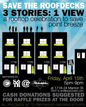 We just got this flyer in the mail (read: inbox) and thought we should share, given our coverage on the Point Breeze moratorium issue with Anna Verna. The party is being held this Friday in the heart of the very neighborhood fighting these three-story roof decks (and chances are Anna Verna