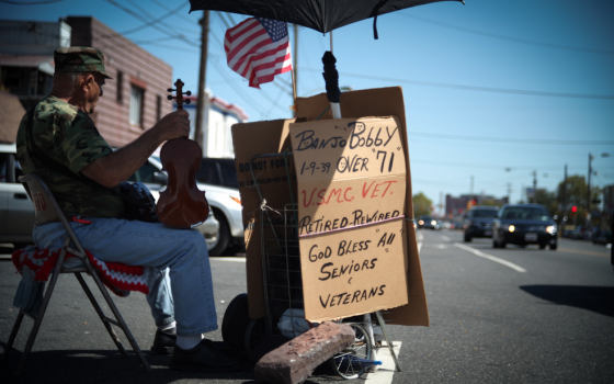 Marine Corp vet Robert " Banjo Bobby" Pfenning rests his violin on his thigh as passersby applaud his music on the side of Oregon Avenue.