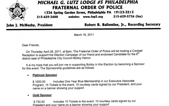 A recent solicitation from the Fraternal Order of Police seems innocuous enough as a fundraiser for City Council candidate Bobby Henon. The April 28 cocktail reception to support the campaign sounds fun (we weren't invited however) but there is one thing we did notice, thanks to help from an anonymous