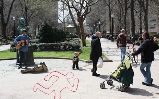 On Friday at 5pm, while many enjoyed their happy hour sliders at Rouge, an intoxicated man was stabbed right at the corner of 18th and Walnut. "A doorman at one of the luxury highrises surrounding the park described the men as appearing to be homeless." The actual violence was
