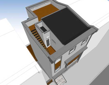 The result is a modern style 2,000-square-foot home with 3 bedrooms, including a master suite, two-and-a-half baths, a finished basement and a downstairs family room area that sings with natural light in the afternoon. Gilbert, who has renovated his own homes before and studied Industrial Design at the University of the Arts, wanted “to design a house that was exciting and would take advantage of the light.” The three large windows on the first floor were designed specifically to maximize shade in the summertime and attract heat and light in the winter. Bamboo hardwood floors run throughout the house, including a stylish black-colored first floor. A roof deck looks one way out to Girard College and towards Center City in the other direction. But perhaps the most unique aspect of the thoughtful new design is a third-floor hallway that used to be covered by a roof and lead to a window that looked south over Girard Avenue. Gilbert and his team deemed that hallway to be pointless; they tore down the roof and turned the hallway into an outdoor walk that leads to a roof deck. (They also built the deck with Trex, made from recycled plastic and waste wood.) The spot for the old window remains, as a concrete outline, giving the aesthetic of something like an old stone house.