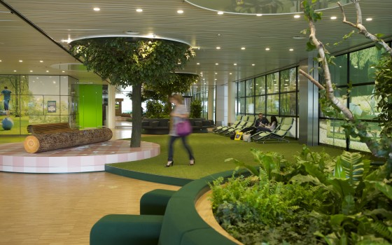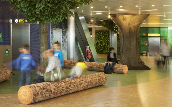Yesterday morning Schiphol airport in Amsterdam launched the world’s first airport park, which is centered around an almost-razed 130-year-old tree. The airport park has an outdoor terrace and, inside, emulates the outdoors with projected butterflies and recorded sounds of bicycle bells and animals. The park features ivy chairs, fiber-optic cables, tube lighting and cell phone charging stations that requires you to pedal a energy-generating bike; the Park Cafe has fresh juices and organic burgers. Three weeks ago the Philadelphia airport opened a mini-hotel with 13 Minute Suites and two workstation cubicles to help us work longer or sleep so we can work longer later. Yay America.
