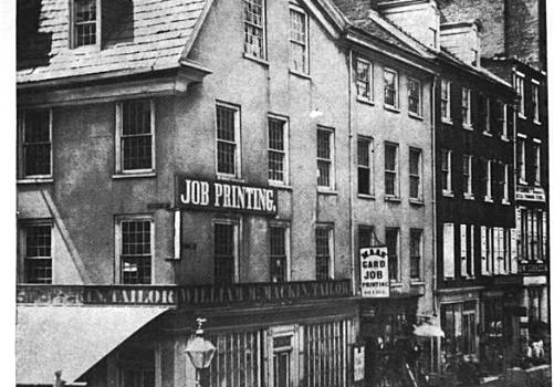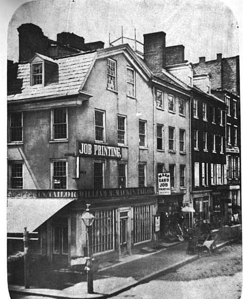 This building at the southwest corner of the intersection at Second and Chestnut Streets was owned by well-known antiquary (of 1843) John McAllister. His storefront, which was decorated with simple white shutters and windowpanes, is an example of a traditional, imported English style that endured in Philadelphia long after the Colonial Period had ended. Seen ten years later, in 1854, this same storefront had been transformed to suit its utility. McAllister’s occupied the near side building where he sold mathematical and optical instruments. Privately owned businesses such as this were common to the east end of Chestnut Street during this decade. —-Alex Graziano