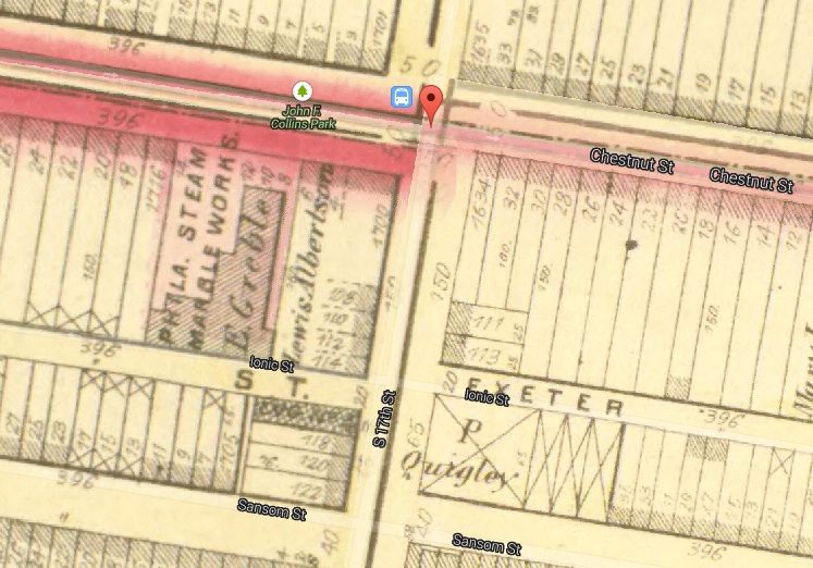 17th & Chestnut is among the city’s more bustling intersections. Every retail operation that has come to occupy its southwest corner has enjoyed the early fruits of this bustling. The location did begin its recorded history as a private residence however. As shown in the image taken from G.M. Hopkins’ 1875 Philadelphia Atlas, 1700 Chestnut St. and its adjoining structure belonged to one Lewis Albertson.
