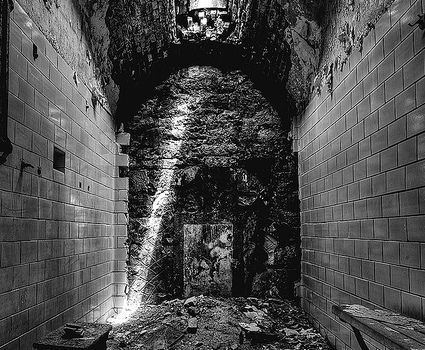 The design proposed by John Haviland was known as the radial plan. From overhead, the prison looks akin to a bike wheel. Cells were contained within the spokes of the wheel while a guard tower overlooks the Penitentiary from the center. Despite its decrepit and daunting appearance, this prison was revolutionary in that it set forth the new goal of promoting rehabilitation rather than punishment (as prisons of the past had). Inmates were placed in isolation within the wings of the prison and guards could overlook their confinement from the central tower. Cells were composed of concrete with a single glass skylight on top through which both guards, and supposedly God, could observe them (the skylights were known as the “Eye of God”).