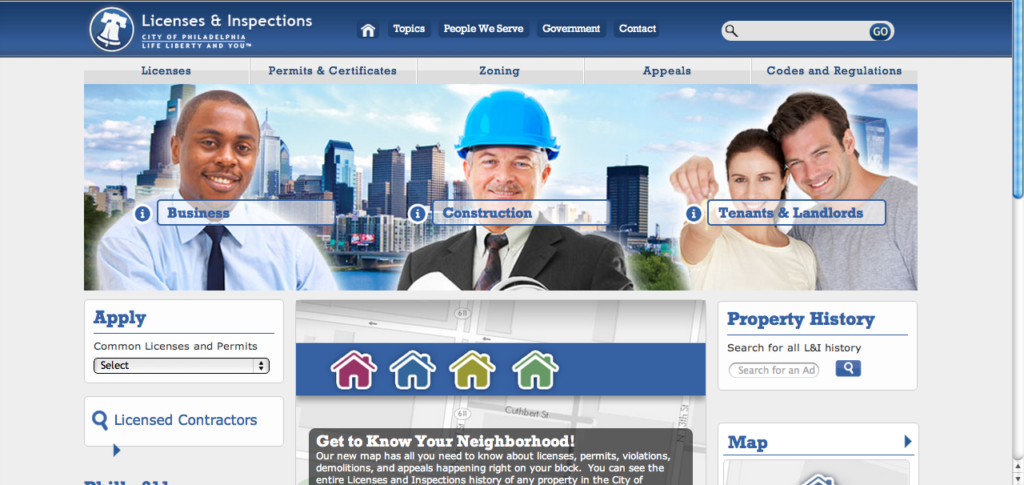 This week, the Department of Licenses and Inspections (L&I, for short) launched a new website. An increased user-friendliness and a general appearance that the website wasn’t designed in 1996 are two of the most immediately noticeable changes from the past. Check out the new homepage: