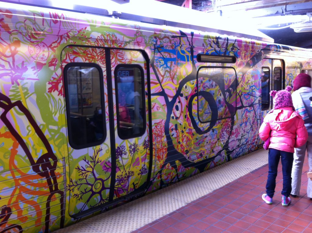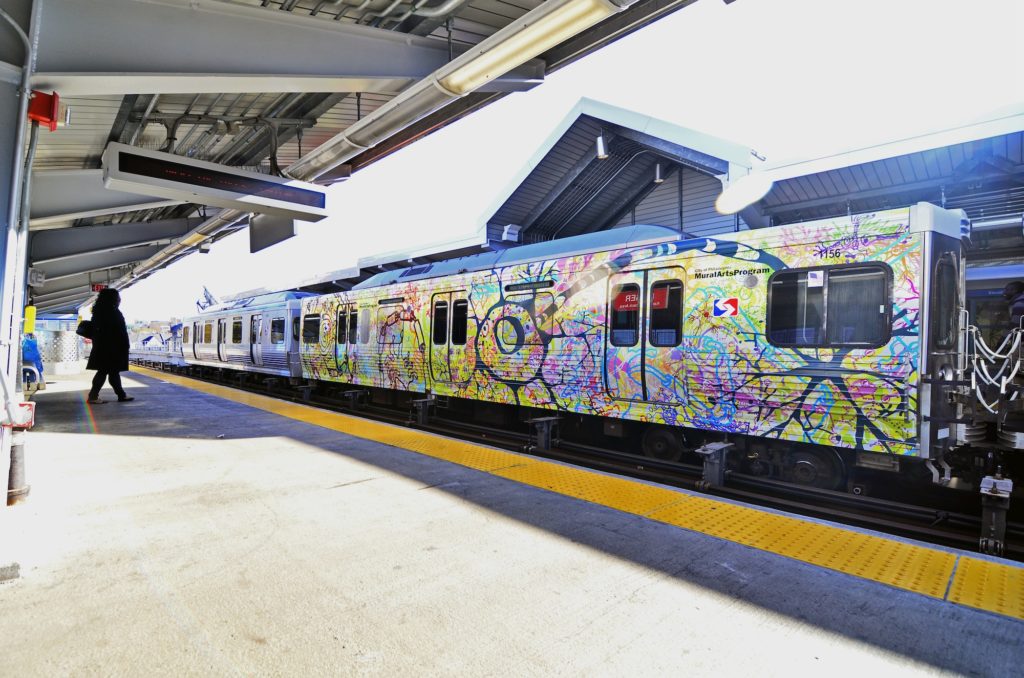 Student art wrapped around a train has transformed it into a moving mural as part of a Mural Arts program to showcase students’ work. Students worked with artist Ben Volta on the We Are All Neurons project, learning about the history of transit art while exploring connections between the brain, art, and creativity. The result is a train car wrapped with a colorful map of a brain, and connections between the neurons like the El connects the different neighborhoods of the city.
