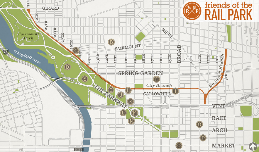 The Friends of Rail Park is the newly rebranded incarnation of the group formerly known as Viaduct Green. The group recently partnered with the OLIN studio to develop a vision for half a mile of the three mile former rail line that begins at Broad Street and runs three blocks west. The group calls it the park’s City Branch. The proposed park runs along an old rail line along Pennsylvania Avenue until part of it emerges below street level behind the Rodin Museum near 22nd and the Parkway. Around 18th and Callowhill, the part of the space that can be seen now is overgrown brush. The tunnel eventually connects with the proposed Reading Viaduct.