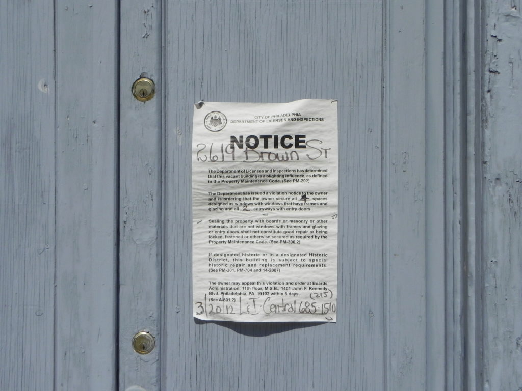 The blighted three-story structure at 2619 Brown St. is located at the northeastern intersection of Brown and Taney Streets. On March 20th of this year, L&I posted a notice demanding the owner of the structure secure the doors and windows. As it stands now, the ground-floor of the property, which was likely once home to a commercial space, is boarded up. Next door to the east, stands another abandoned building. And to the north is a run of four attached garages, which look a lot like the garages that are in the rear of the property, accessible by a private driveway.