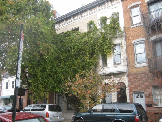The buildings on either side are in rough shape. 723-25 Carpenter St. has a plant out front that appears to be in the process of consuming the entire building. At 729 Carpenter St., it looks like the roof is ready to fall in.