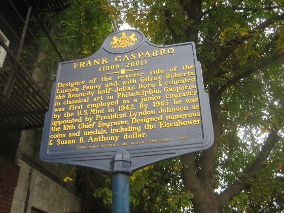 On the 700 block of Carpenter St., in the middle of the block on the north side of the street, sits 727 Carpenter St., a building we’ve wondered about for years. At four stories tall, it looms over the two and three-story homes that fill the rest of the block. The front of the building features a tenement-style fire escape, an uncommon site in this neighborhood and most others in Philadelphia. Many of the windows are boarded up, but the first floor plywood placeholders are fancifully painted with curtains and flowers. And perhaps most curiously, a historical marker sits right outside, paying tribute to Frank Gasparro, the man who designed the back of the penny.