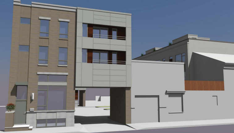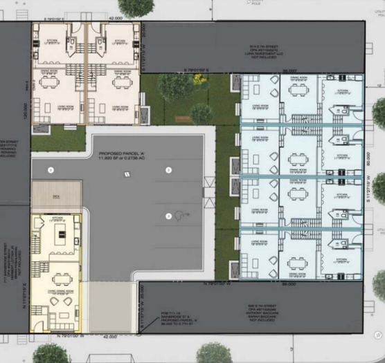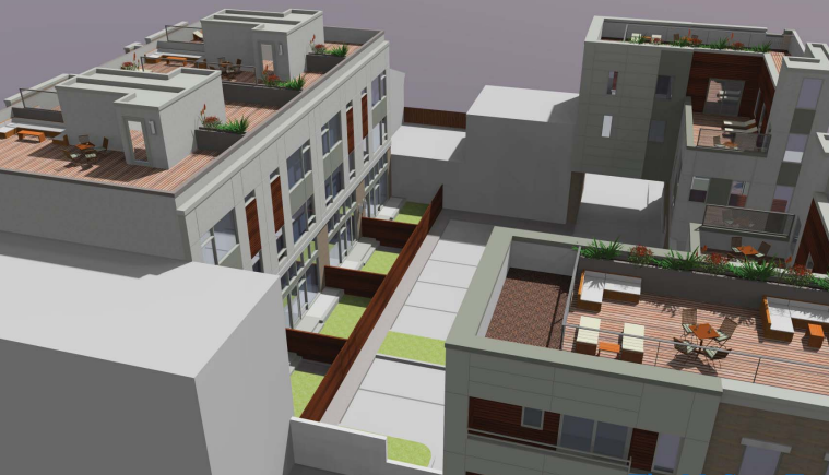 You can see, the plans call for four homes on 7th Street, two homes on Kater Street, and an L-shaped home on Bainbridge Street. Each of the homes will have a parking space in a shared lot, and it appears that all but one of the homes will have some outdoor space at ground level. We give the architects credit for navigating a tricky site that's shaped like a Tetris piece thanks to two buildings on 7th Street that won't be changing as a result of this project.