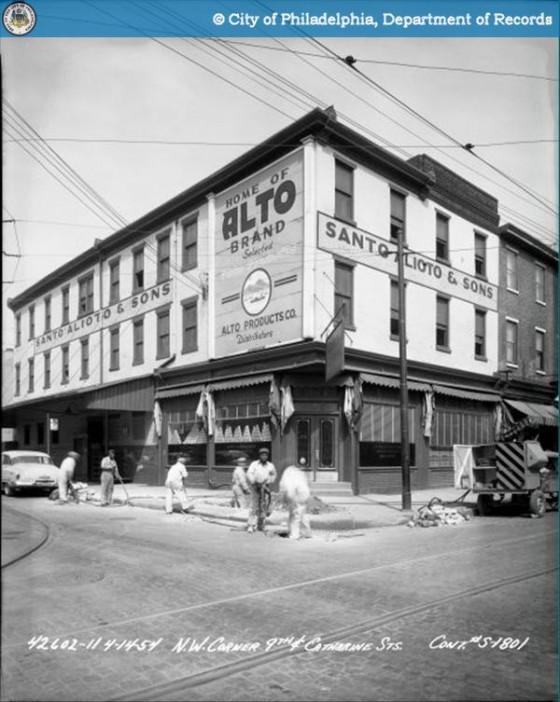 On the northwest corner of 9th and Catharine Sts. once stood a retail market owned by the Alioto family, which specialized in imported olive oil, with the brand name Alto. The photo below is from 1954.