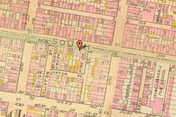 The image here below, taken from G.W. Bromley’s 1910 Philadelphia Atlas, shows the Fire Company in its South Street location, but this only hints at the building’s significance.