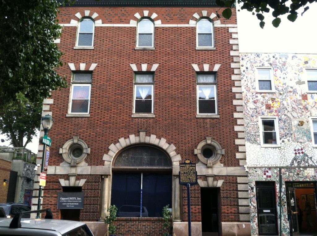1016 South St. stands directly next to Philadelphia mosaic artist Isaiah Zager’s greatest masterpiece, the walk-through debris sculpture aptly called the Magic Garden. While the eyes of most viewers will understandably be drawn to this highly unusual sight, right next to it stands a building with a fair degree of its own historical importance. Indeed, this location would become a firehouse in 1871 when Philadelphia established its paid municipal fire services. The undated photograph below shows the firehouse somewhere near the turn of the century, as denoted by the use of a horse-drawn fire truck.