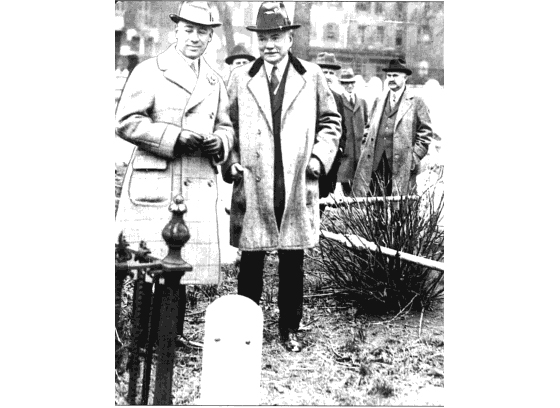 By the start of the 20th century, however, the cemetery had taken on the complexion of its surrounding neighborhood. That is, it was covered in refuse. In the 1924 photo here, taken from Thomas H. Keels’ Philadelphia Graveyards and Cemeteries, Mayor W. Freeland Kendrick and then city council president Charles Hall inspect the grounds. Presumably, they didn’t like what they saw.