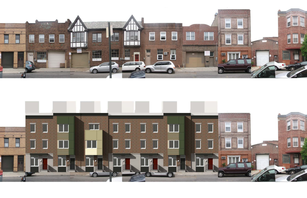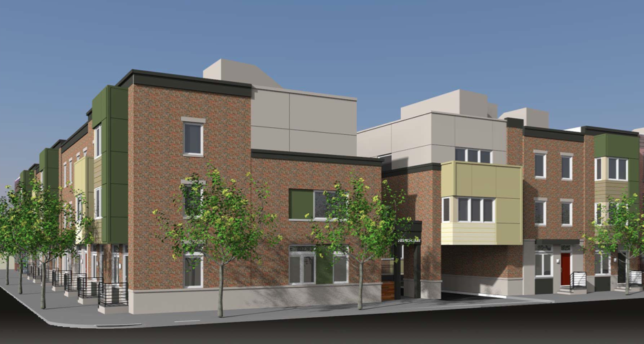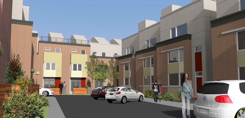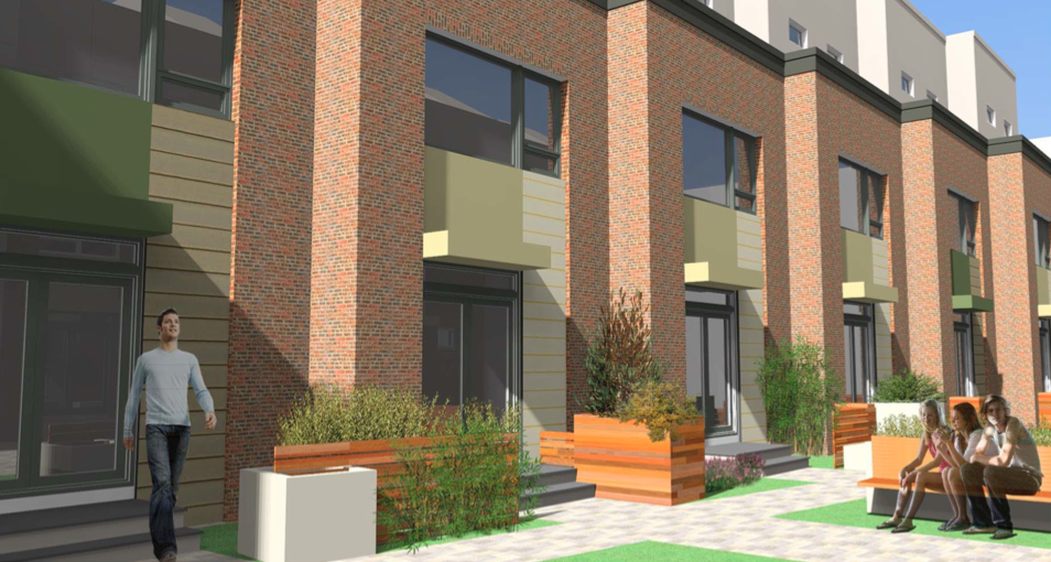 A refresher- the homes will range in size from 1900-2500 sqft, and will rise about 34′ high. They will have high-end finishes and will be offered as rentals at first, with the idea to sell them off within five years. This model tends to be US Construction’s preferred order of business. When we first described the project after a presentation to BVTW, we were able to look at renderings and a site plan, but didn’t have digital copies to share. But today, thanks to our friends at JKR Partners, we have all of those things for you to gawk at.