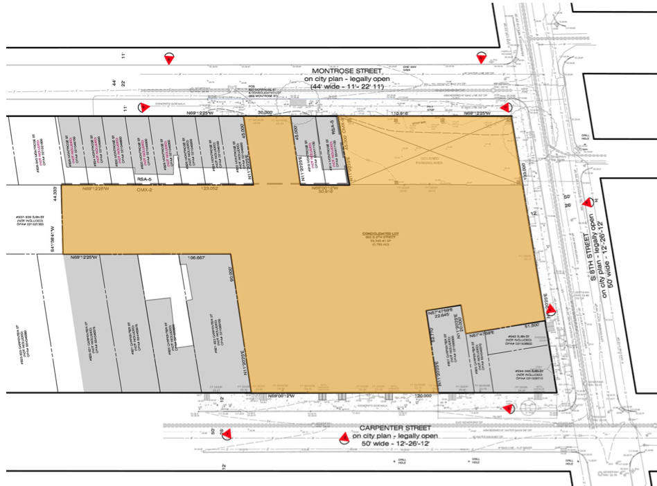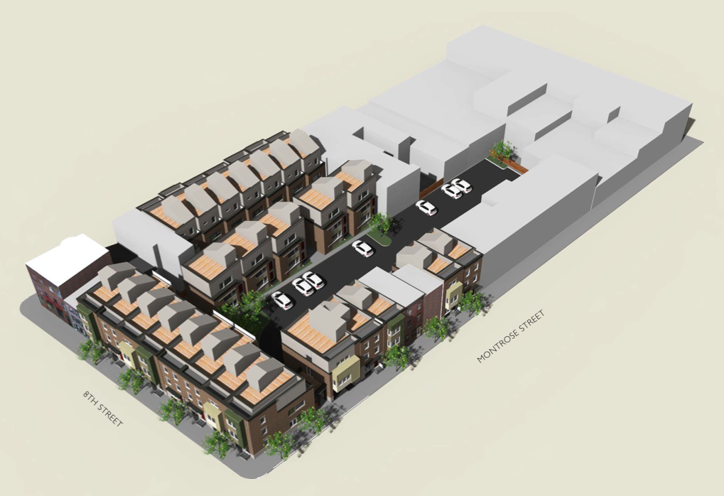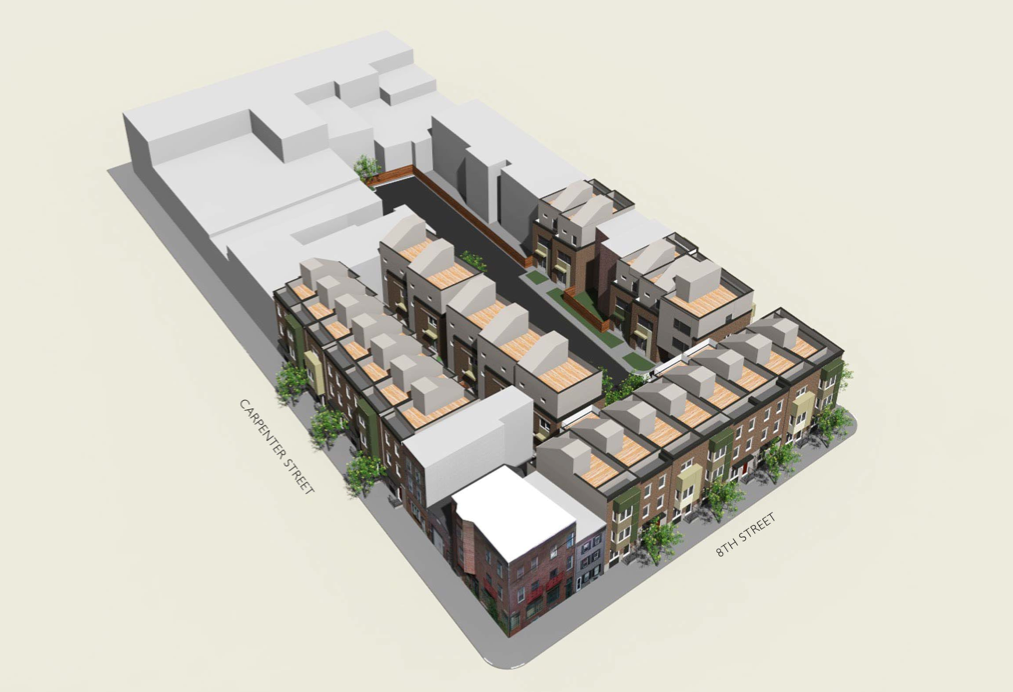 Several months ago, we told you about Mildred Court, a plan to redevelop half of a square block in Bella Vista, including a former 7-Up bottling plant on Carpenter Street. In the intervening time, the project has gone through the civic design review process, and has gotten approval from the ZBA. It’s largely the same as what we described in May, though an extra unit has been added to the project. In all twenty-five units will soon rise on the 800 blocks of Monrose and Carpenter Streets, and the 900 block of S. 8th Street. Currently, most of the parcel outside of the former bottling plant is woefully underused.