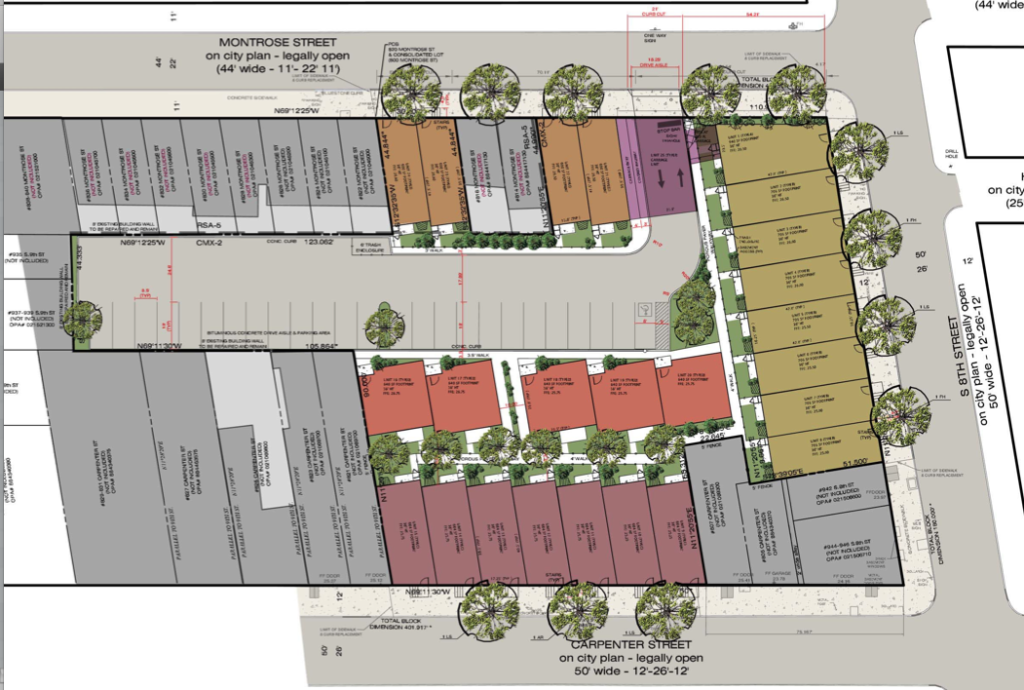 Seven homes on Carpenter, eight on 8th St., five on Montrose, and five more inside the complex