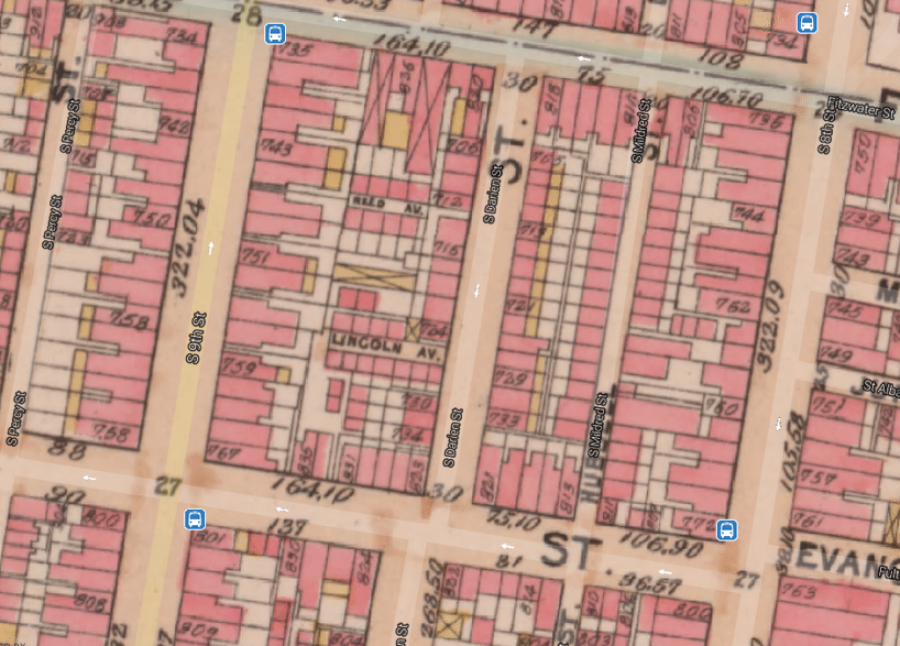 Of course, we’ve wondered for years why this little block even exists and how long it’s been like this. Looking back at some historical maps of the city, the courtyard seems to date back to the time that the neighborhood was built, probably around the 1860s. In several maps, the tiny block is referred to as Lincoln Avenue, and City records still refer to it today as such.