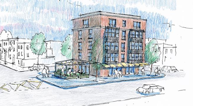 By the end of 2015, the owner had an agreement of sale with developers who were planning a five-story mixed-use building with twelve apartments. With feedback from the neighborhood, they revised their project down to four stories with nine apartments, but that project got denied at the ZBA in January. After considering their options for a few months, the developers changed their proposal again, designing a five-story building with seven apartments and a fresh fruit and vegetable element as part of a first floor retail space. The project received permits over the counter, according to Plan Philly, because it takes advantage of a Fresh Food Market bonus in the Zoning Code which allows an extra fifteen feet of height for a building that contains “an establishment in which the sale of fresh fruits and vegetables to the general public occupies at least 50% of the display area.”