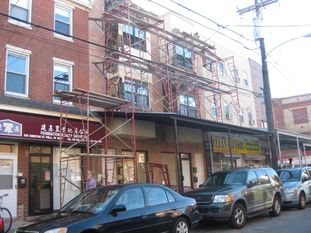 Last fall, we told you about a pair of rotting bay windows in Bella Vista, around the corner from the Italian Market. At that time, there was a Stop Work Order posted on the building because the work was apparently being done without a permit. We were frankly more concerned about the dodgy looking setup of the scaffolding, which sat on top of a metal awning.