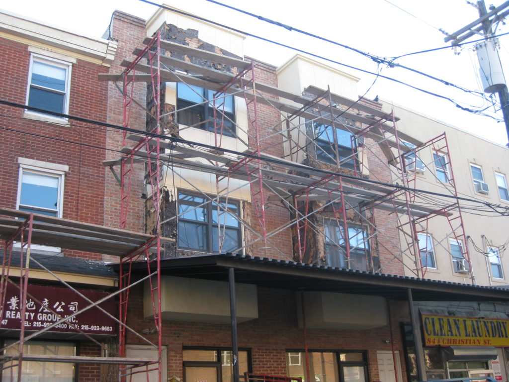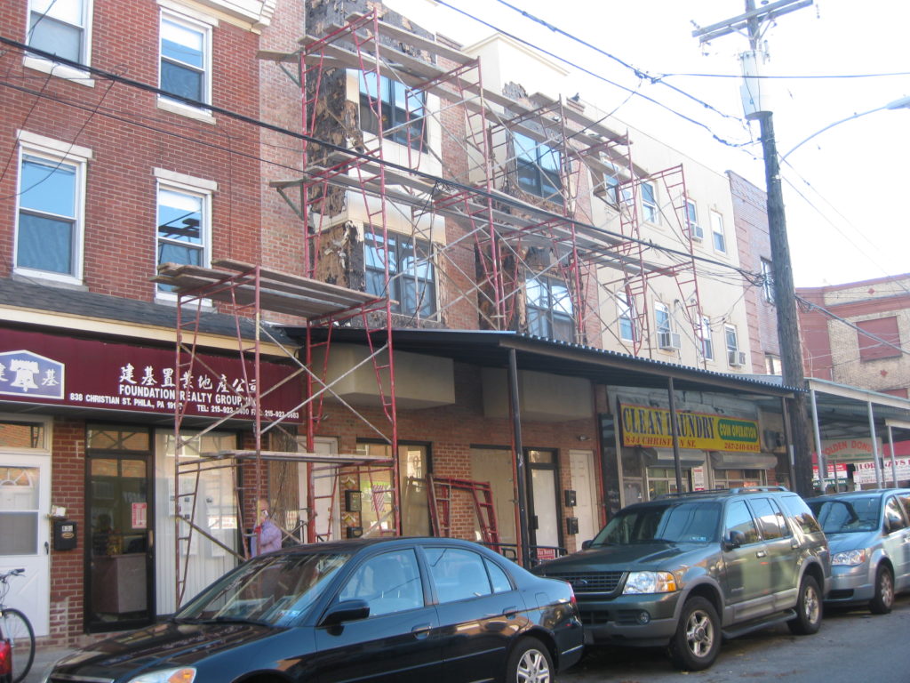 A couple of readers have reached out in recent weeks, wondering and worrying about some scaffolding that’s currently in place at 838-42 Christian St., just a couple of steps away from the Italian Market. We remember visiting the market a decade ago and wondering how it was possible that these buildings could be in such deplorable condition so close to a tourist mecca. When Good Fortune Investments bought the properties about five years ago, they clearly put some serious dollars into renovating them, but it seems something went wrong with the bay windows.