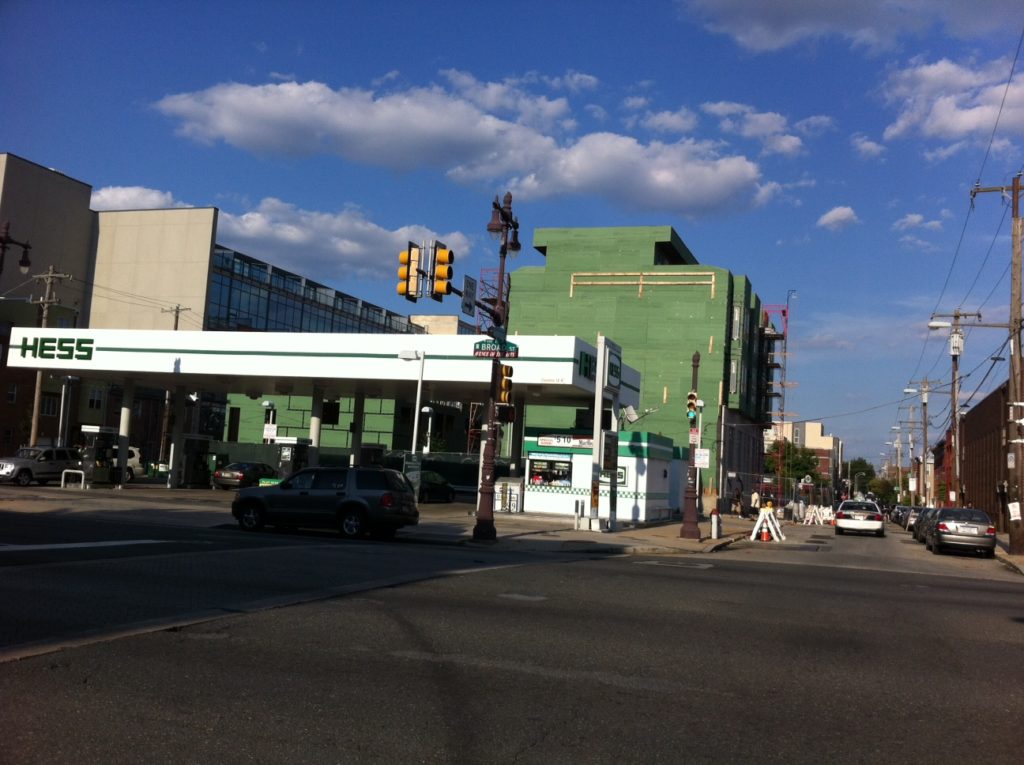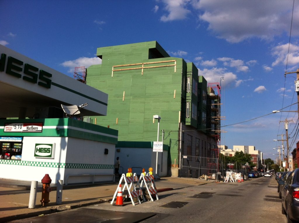 The four foundations that we told you about in March are now fully framed out with facade work well underway. Standing quite tall next to the Hess station, they’re almost begging the place to be torn down and replaced with something with more height. Alas, we doubt that’s happening anytime soon.