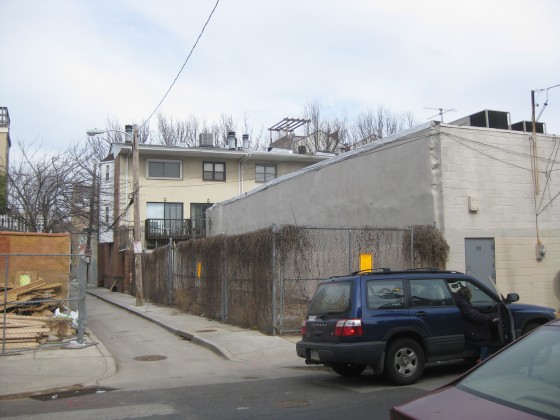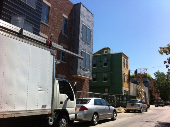 Meanwhile, just to the east, a home has been framed out where a chain link fence formerly enclosed a vacant lot. According to some comments from when we originally told you about this development, this fence grew morning glories every summer, making it more important to some neighbors than you might have otherwise expected. Like the mural, the fence is no more.