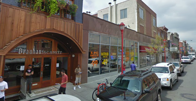 As you can see, the liquor store was located at 724 South St., there was a furniture store just to the east, and Brauhaus Schmitz (which, incidentally, took over a furniture store when it opened) next door. Now, the liquor store and the furniture store are missing, while the bar is still very much doing its thing.