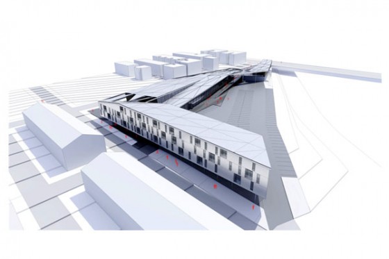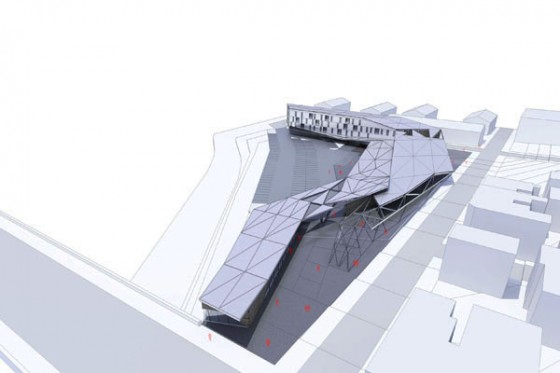 A few years back, Interface Studio Architects, and the Community Design Collaborative created plans for this site as a part of the Infill Challenge. That design was ultra-contemporary, using interesting materials and also featured a row of housing units onto the site as well. While the design we got fronts the parking lot onto Girard Avenue, the Infill design did its best to hide the parking on the western side of the development, next to the train tracks. Just check out these renderings of what might have been: