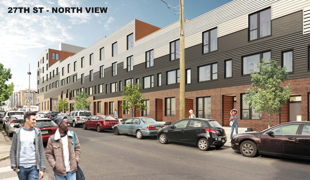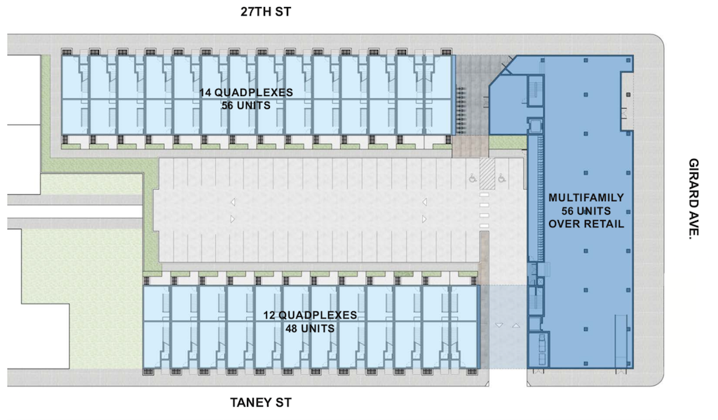 Adco still owns the property and they’ve found a new partner in Callahan Ward to finally redevelop this long vacant gap in the neighborhood. and the joint venture will be presenting the plan to Civic Design Review next month, with some significant changes from the concept from a few years back. There’s still a mixed-use building coming to Girard, but it will be smaller, with 56 units and about 9,000 sqft for commercial use. The homes on 27th Street are changing into quadplexes and increasing in number, with (coincidentally) another 56 units coming to that part of the development. And thankfully, the parking lot will shrink with the addition of a dozen more quadplexes on the 26th Street side. Check out these renderings from ISA.