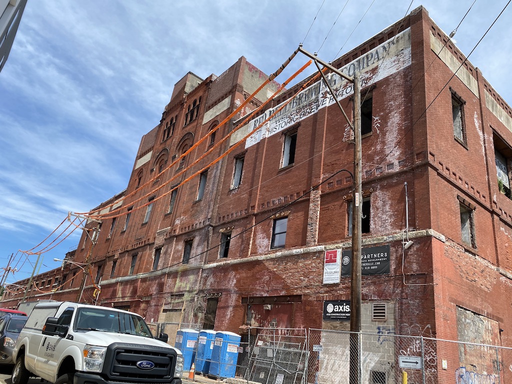 Perhaps even more exciting is the ongoing renovation of the former Red Bell, nee Poth Brewery on the north side of the 3100 block of Jefferson Street. We told you a couple years back that redevelopment was on the horizon for this long vacant property, and as you can see, redevelopment is indeed ongoing. As we mentioned before, MM Partners purchased this huge and handsome edifice, which makes sense given their sizable footprint in Brewerytown. When they’re done doing what they’re doing, the building will have 128 apartments and 25K sqft of commercial space. More importantly, one of the trophy buildings in the neighborhood will be brought back to active use, maintaining an important connection to the history of the area.