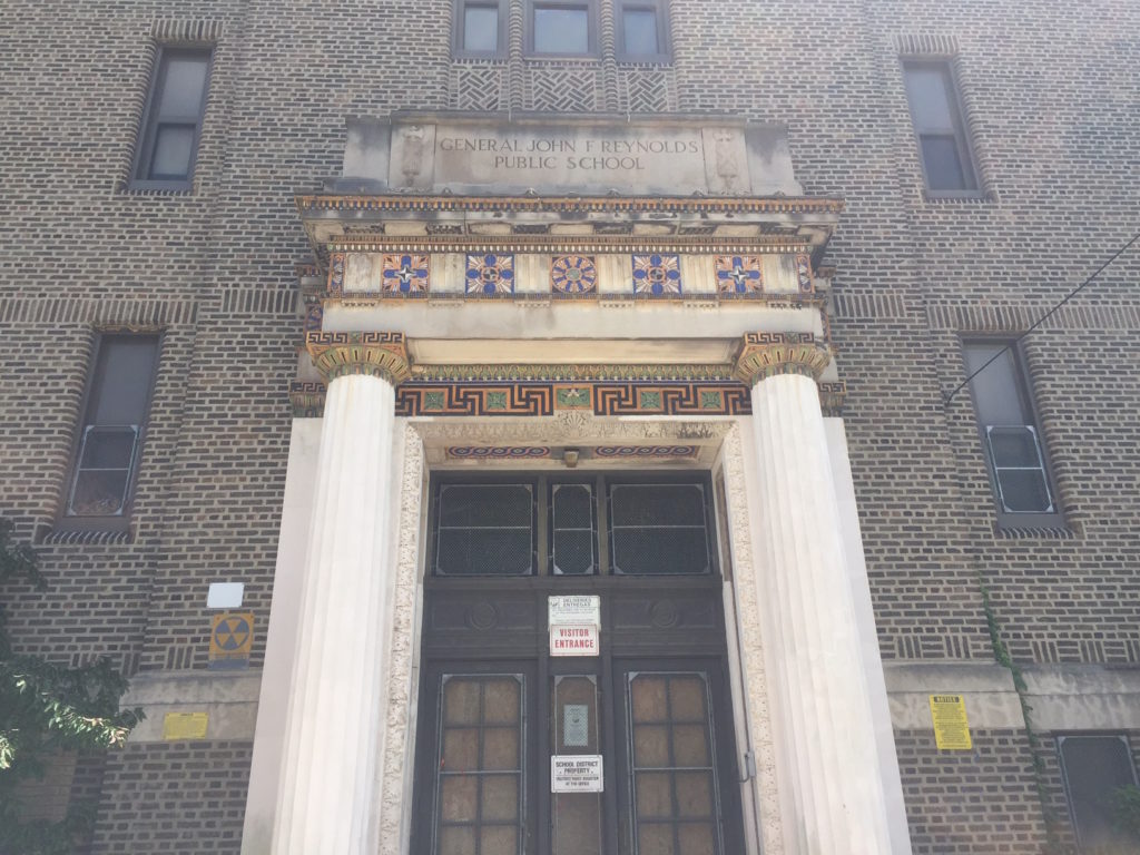 The SRC voted to close down about two dozen public schools back in 2013, and as the wheels of bureaucracy slowly turn, those school buildings are starting to come back to life. A couple weeks ago, at a community meeting in Brewerytown, neighbors learned about a plan to repurpose the shuttered John F. Reynolds School at 24th & Jefferson. This Art Deco building was constructed in the 1920s, designed by renowned Philadelphia school architect Irwin Catharine, and is listed on the National Register of Historic Places. Indeed, it’s a handsome building, and the entrance on 24th Street is incredibly striking.