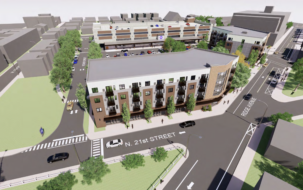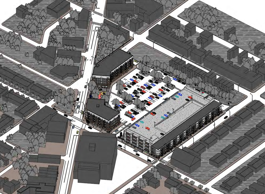 PHA is building four different structures at this site. Fronting 20th Street will be an apartment building with a total of 29 units. Right behind these units will be the building that contains the supermarket, which will also include an urgent care and 190 parking spaces over three stories. The Ridge Avenue side of the property will also include two buildings, with a public plaza in between them. The northern building will have 8,400 sqft of retail and 36 apartments, while the southern building will contain 6,000 sqft of retail and 27 apartments. The space between the eastern buildings and the western buildings will be… a surface parking lot with space for another 150 cars.