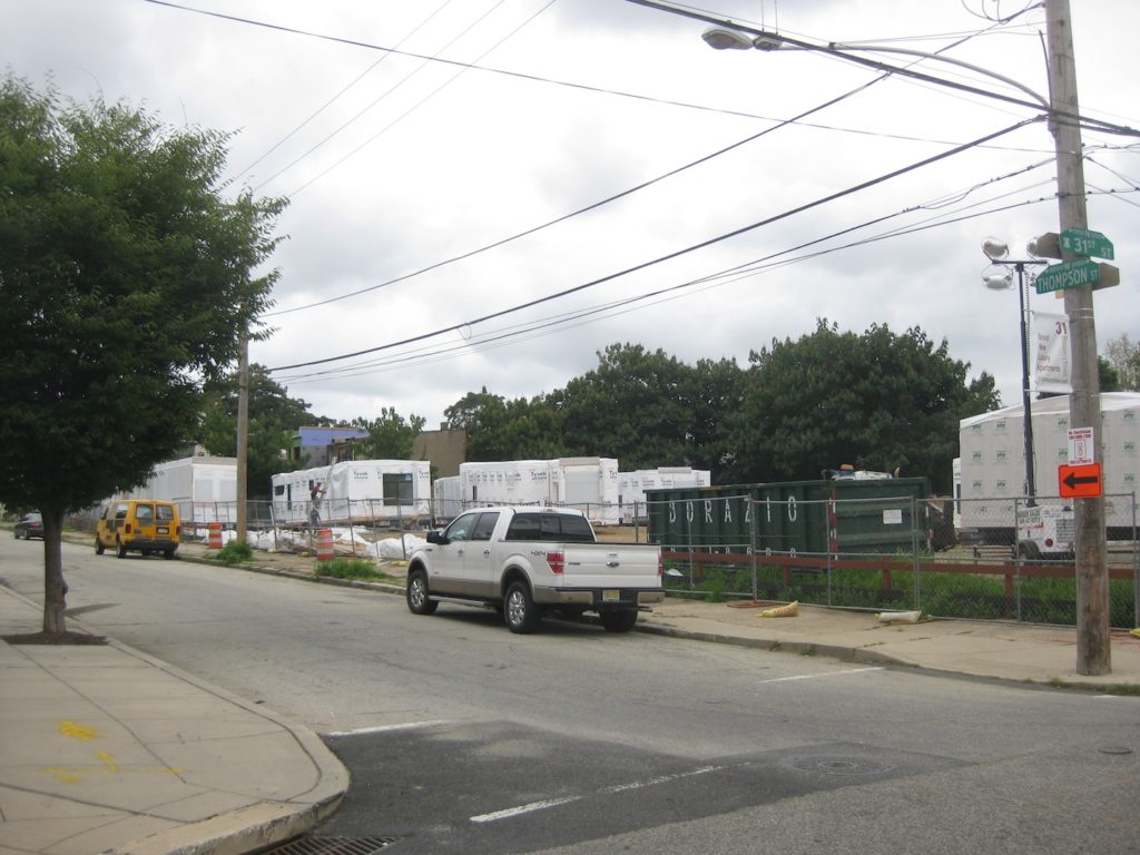 Early this summer, we spotted new construction activity at 31st & Thompson, behind the still kind-of new Brewerytown Bottom Dollar. We were pleased to fill you in on the project, dubbed 31 Brewerytown, as Westrum's newest venture into the neighborhood where they previously built Brewerytown Square. When we passed by the project site today, we were really surprised at the amount of progress in just a few months. And then we realized that it's a modular build and everything made much more sense.
