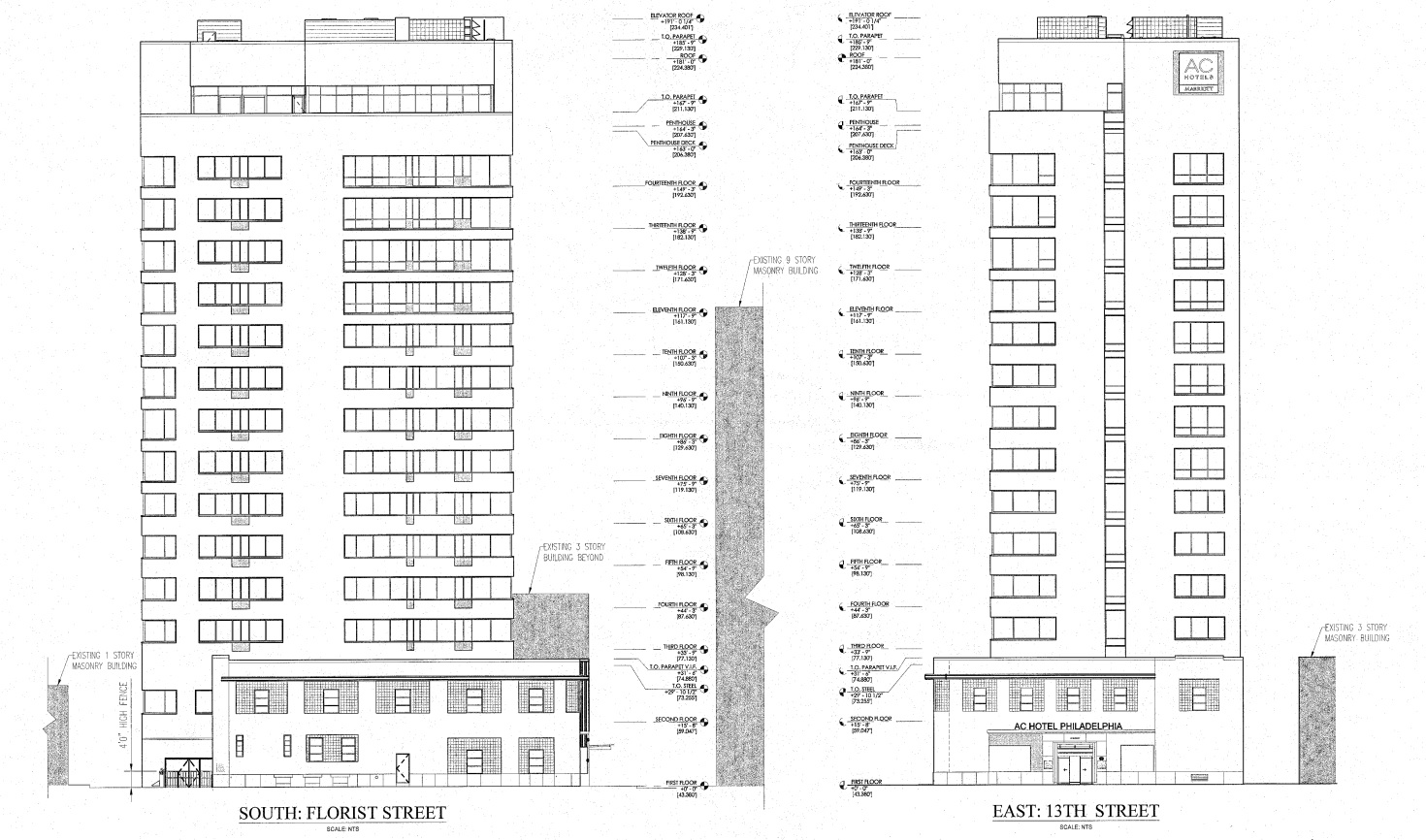 There’s a bit more ambiguity immediately across the street, where another hotel mystery has been on-going for years. The former NFL Films building (amongst many other former uses) sits to the north at 230 N. 13th St., where plans for an overbuild and an AC Hotel were in the works. Designs called for a 12-story overbuild that didn’t meet the existing two-story structure in the most elegant fashion.
