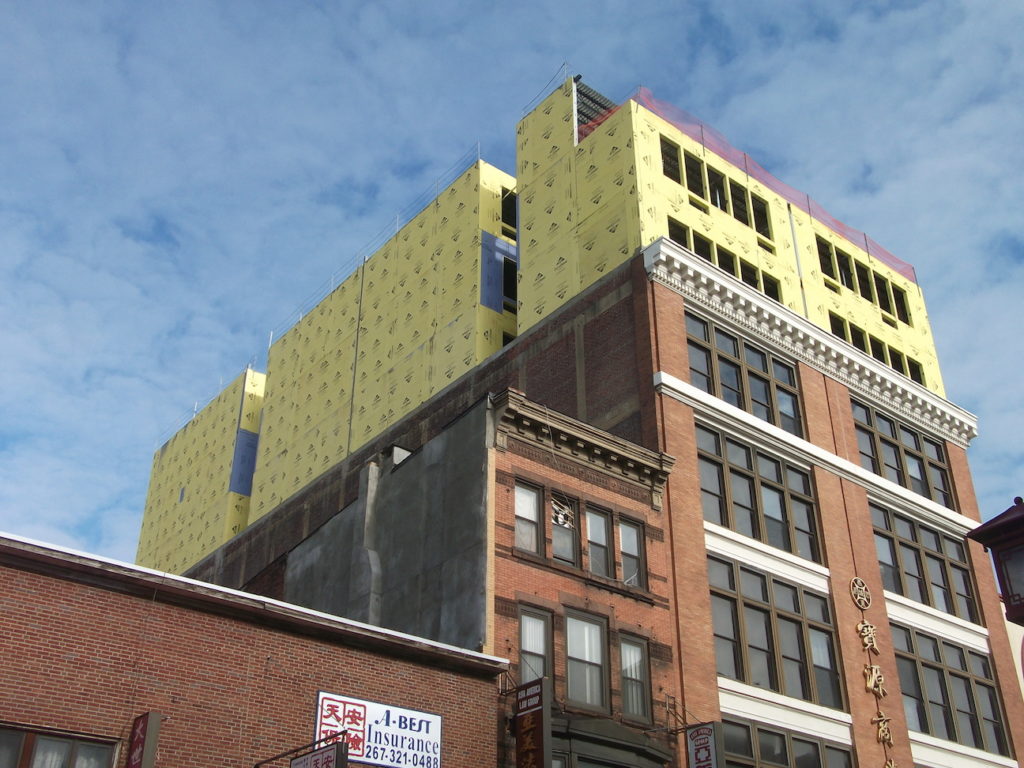After doing a little research, we found out that the building is owned by Landmark Property Group, a company with little discernible footprint in Philadelphia. Some of the permits were pulled by architects from T.C. Lei Associates, the same designers working on a proposed proposed project at 9th & Callowhill. Harman Deutsch is also involved in the project. According to those permits, the addition will contain 48 of hotel units, joining the 36 apartment units already in the building. We wonder how exactly this is going to work, but logistics aside we welcome the prospect of a small scale hotel in the area.