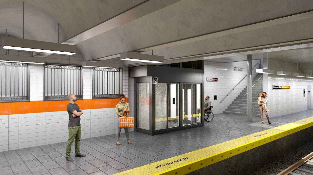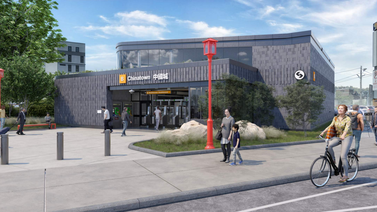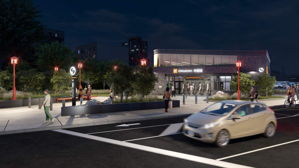 Along with a green roof on the new station, the site will include new trees selected for being indigenous to Chinese gardens. With bollards also being installed around the plaza, hopefully the block won’t end up serving as a de facto parking lot, as it has in the past. With the addition of a seating area, the new plaza should be less hostile for riders walking to and from the station.