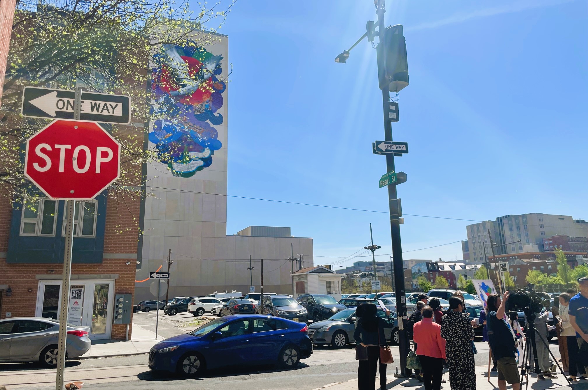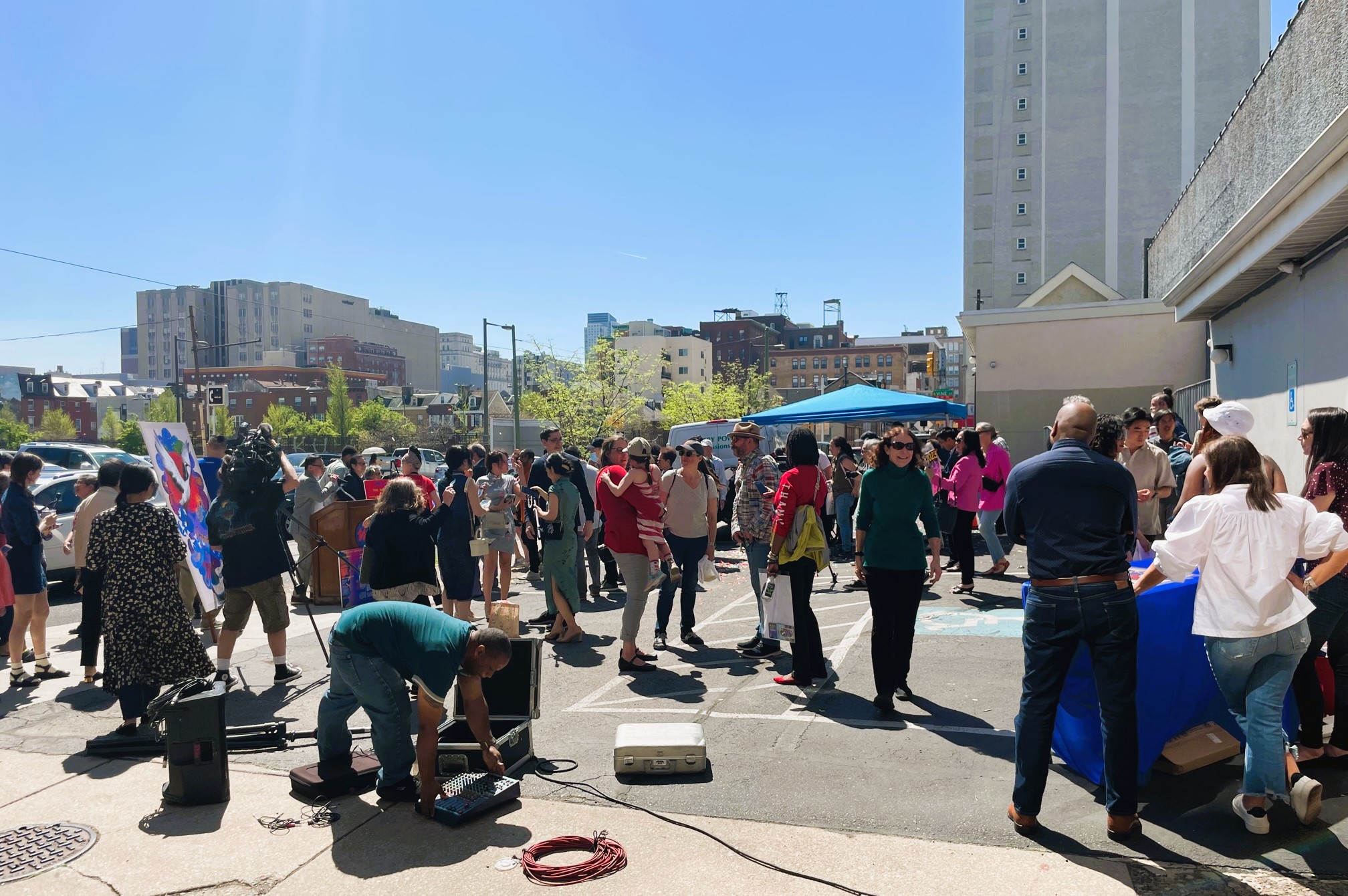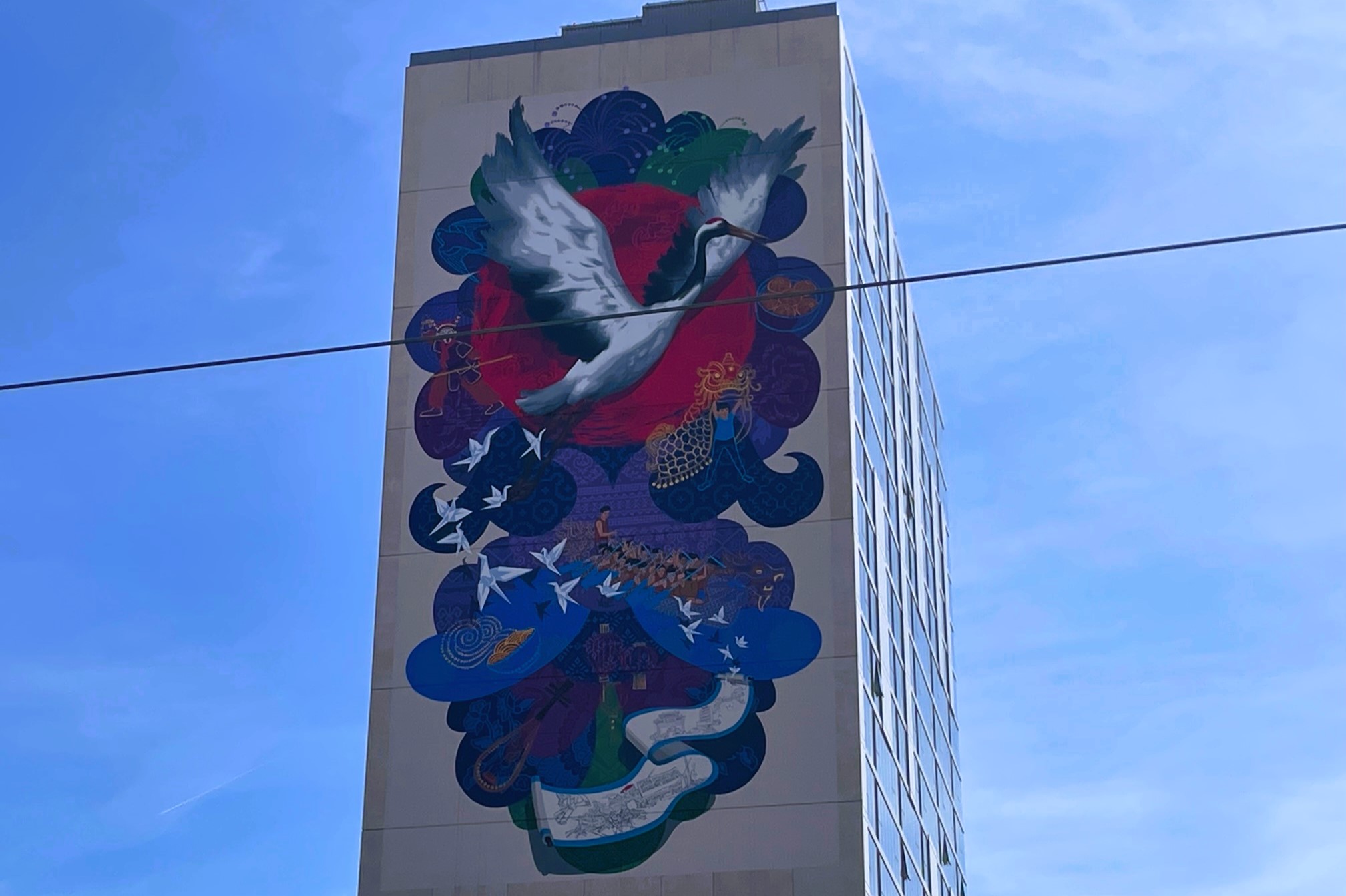 The Crane apartment building at 10th & Vine St. has been completed since 2019 after we last visited the site as it was under construction the year before. Even though this 20-story, 150-unit tower developed by the Philadelphia Chinatown Development Corporation and designed by Studio Agoos Lovera might not be breaking news, the massive new mural on the building certainly feels significant. Managed in by the Mural Arts program, the dedication ceremony for “The Past Supporting the Future” from artists Chenlin Cai, Yvonne Lung, and Eurhi Jones took place on a brilliantly sunny day, with a large crowd gathered to mark the affair.