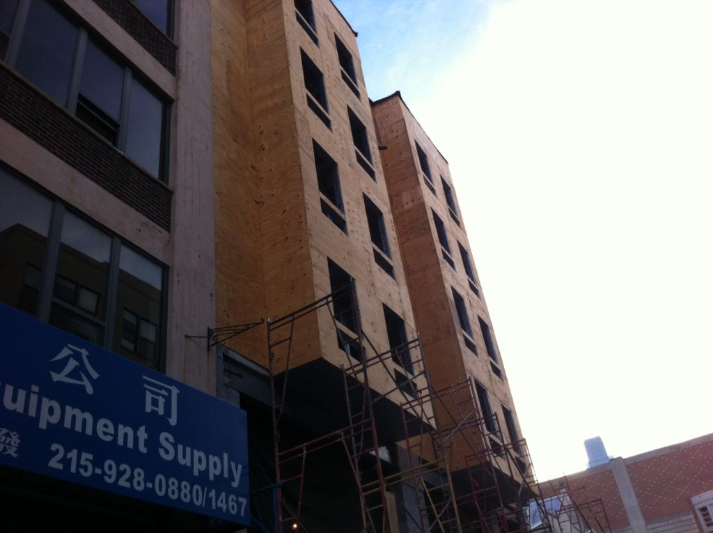 On the plus side, the seemingly endless circling allowed us to stumble upon a new building that’s under construction on one of the neighborhood’s narrower streets. For years, 1020-26 Cherry St. was a surface parking lot. Now, it’s a fully framed out five-story building.