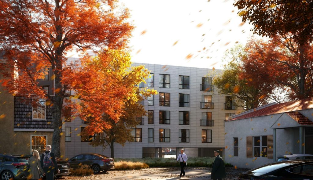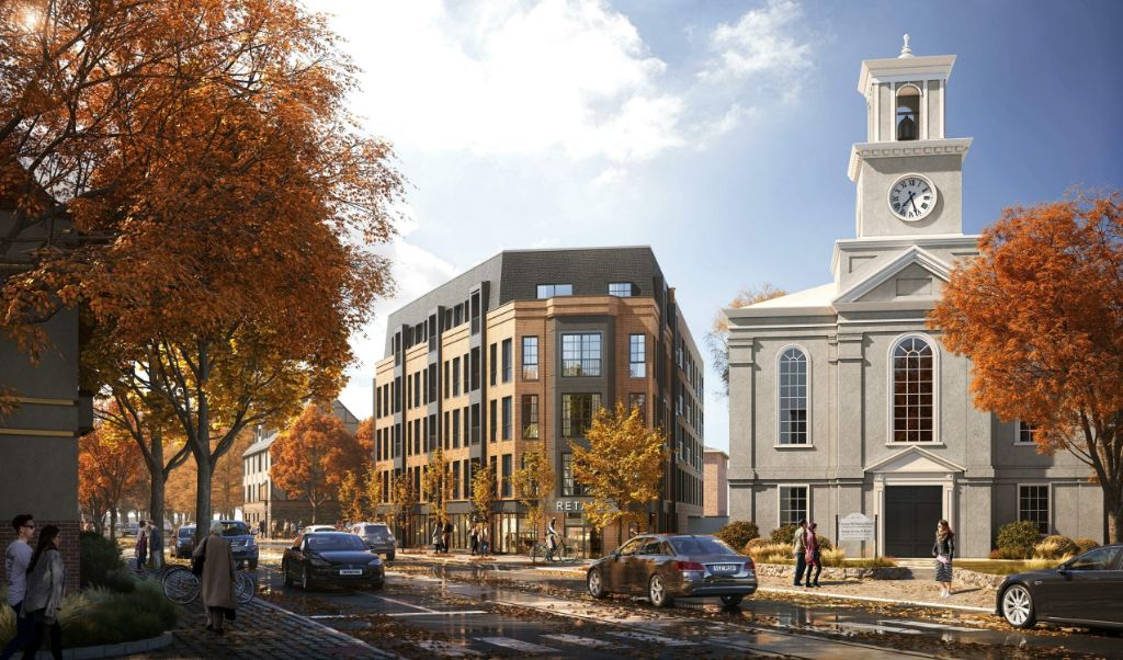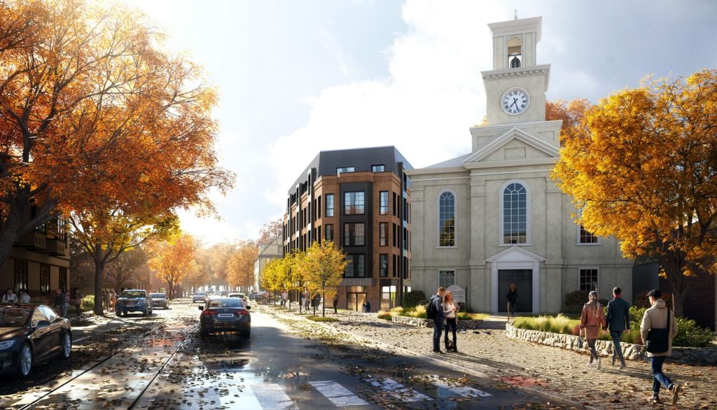 Per plans presented to the Chestnut Hill Community Association, Frankel Enterprises is proposing a 33 unit, mixed-use building, with 3,000 sqft of ground floor commercial, 8 car spaces, 12 bike spaces and a green roof. CosciaMoos is taking on design duties, offering a facade of brick and black metal bays on the unusually shaped lot. This project was to proceed by-right and received zoning and building permits in late 2021. So then, why exactly is this controversial? Let’s check out what’s proposed before we dip into the details.