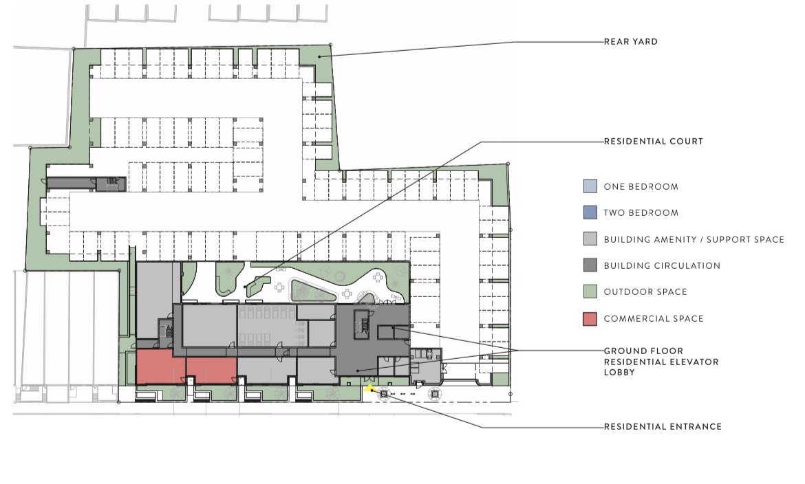These updated plans sure seem to take to heart all of the feedback that has been received thus far. The unit count has been dropped from 148 to 125, with parking increasing from 74 planned spaces up to 93. Bike parking has been increased from 50 to 56 spaces, and two commercial spaces have been added to the proposal along Church Lane. Additionally, the size of the building has been scaled back, with the entire building being set back from the street frontage, along with an additional setback above the fourth floor to lessen the impact of the building’s scale. Street trees have also been added, creating a more pleasant streetscape for those walking past.