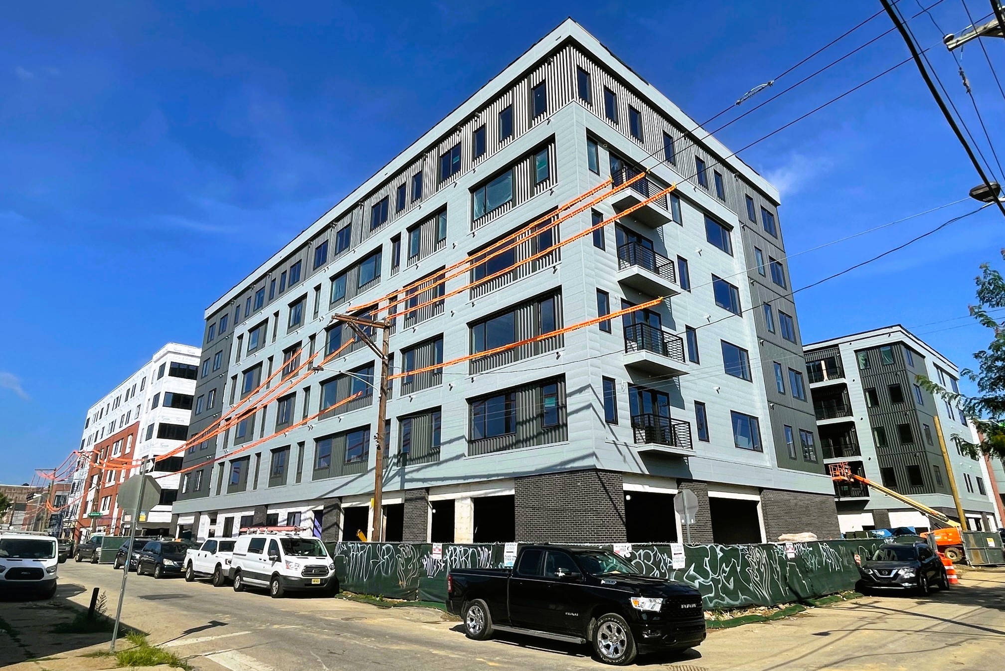 We start our journey at 1929 E. York St. and 1924 E. Hagert St., two properties that were sitting vacant for years, where a couple sizable projects are now well underway. We first told you about these projects back in 2019, when plans changed significantly, possibly due to the area being in a Federal Opportunity Zone. The projects, designed by JKRP Architects, will bring 248 apartments, 31 artist studios, and 65 underground parking spots across two buildings. Construction hadn’t yet started back in 2019, but as you can see, the two projects are moving along nicely.