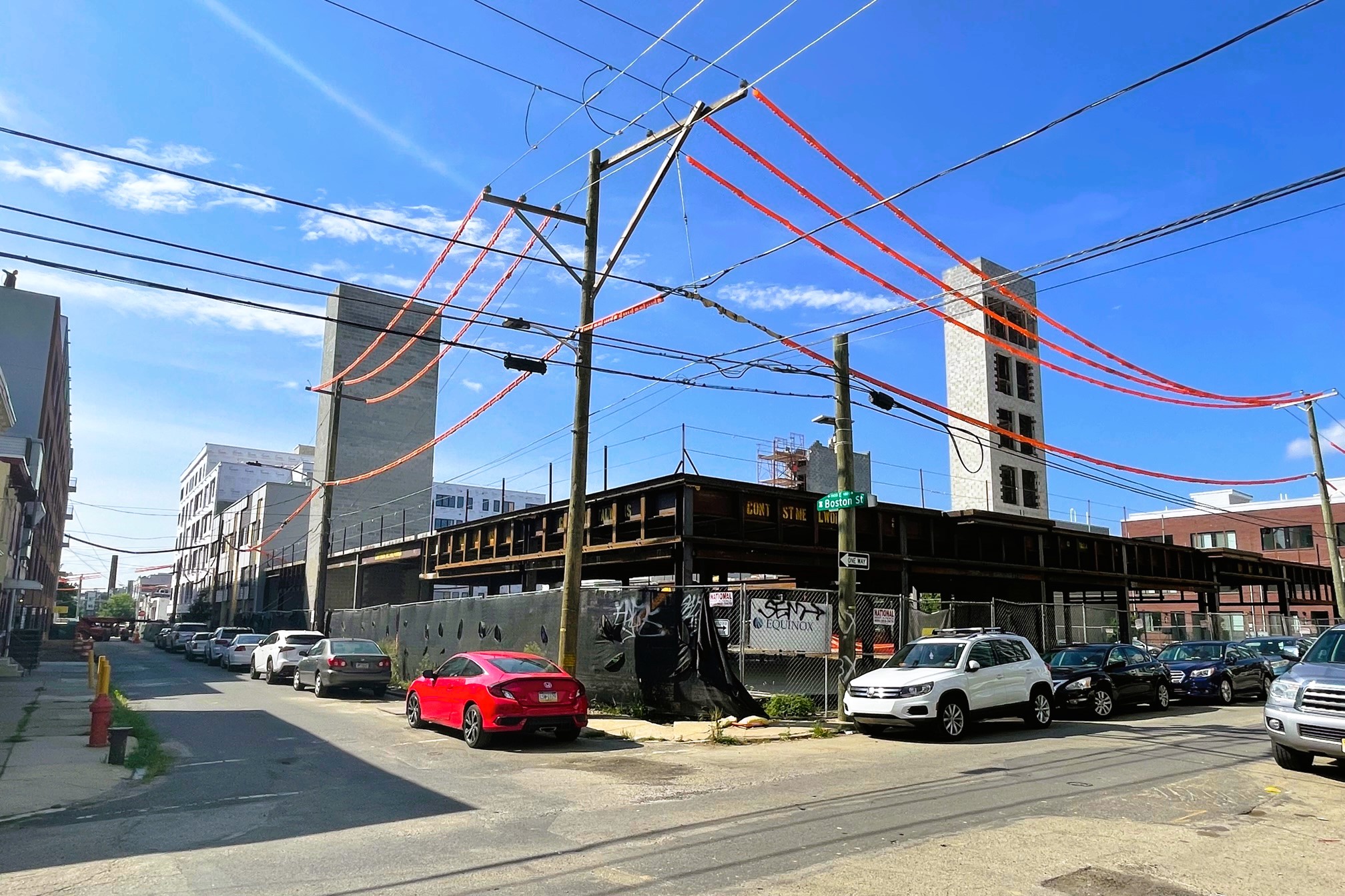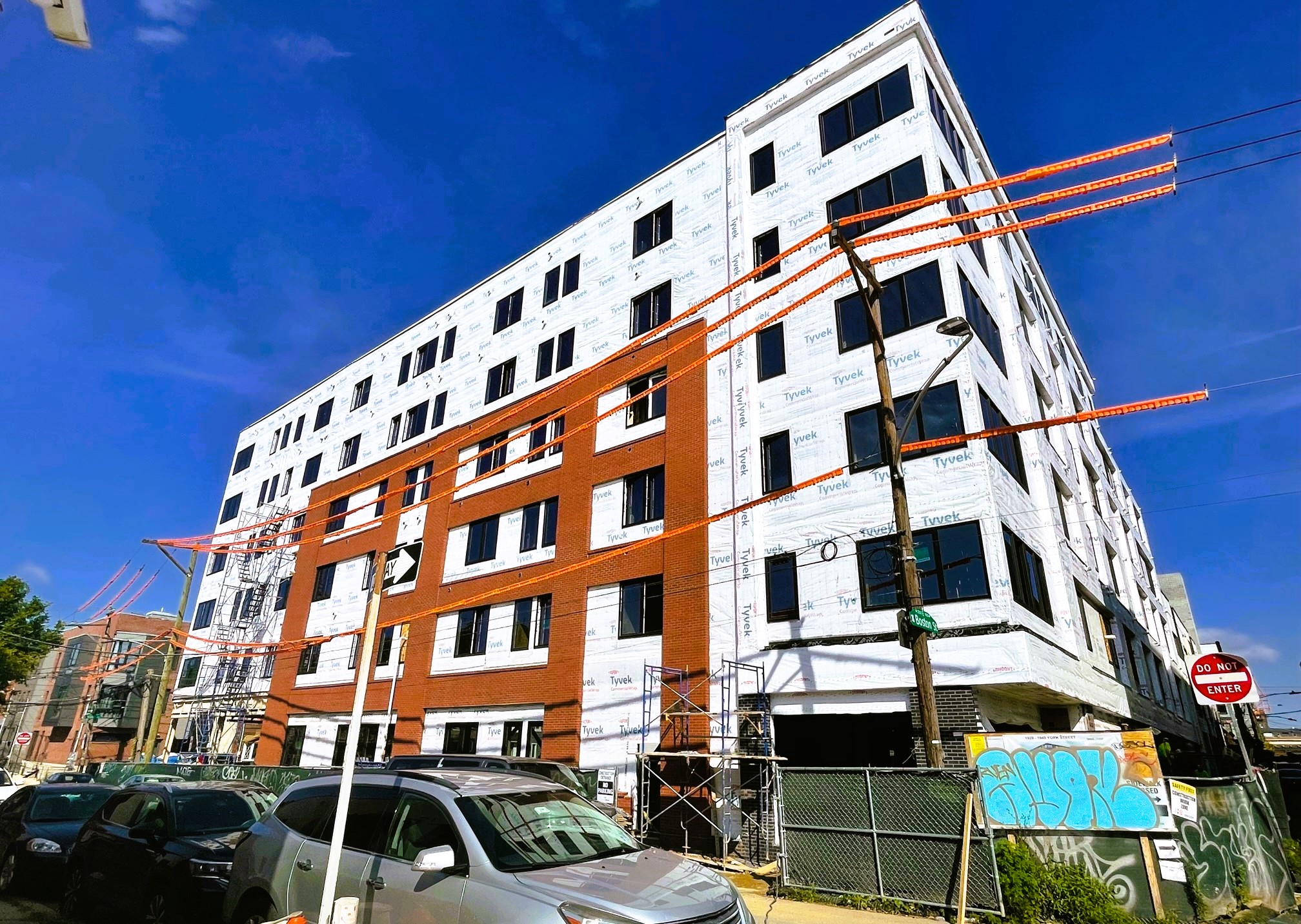 We start our journey at 1929 E. York St. and 1924 E. Hagert St., two properties that were sitting vacant for years, where a couple sizable projects are now well underway. We first told you about these projects back in 2019, when plans changed significantly, possibly due to the area being in a Federal Opportunity Zone. The projects, designed by JKRP Architects, will bring 248 apartments, 31 artist studios, and 65 underground parking spots across two buildings. Construction hadn’t yet started back in 2019, but as you can see, the two projects are moving along nicely.